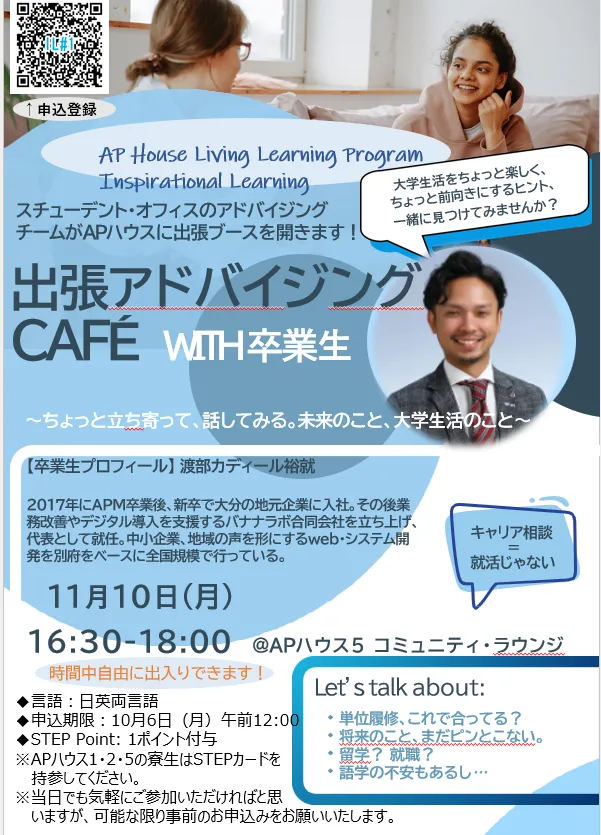 2025年11月10日、立命館アジア太平洋大学(APU)APハウスで開催された「出張アドバイジング CAFE WITH 卒業生」 に、卒業生スピーカーとして参加しました。