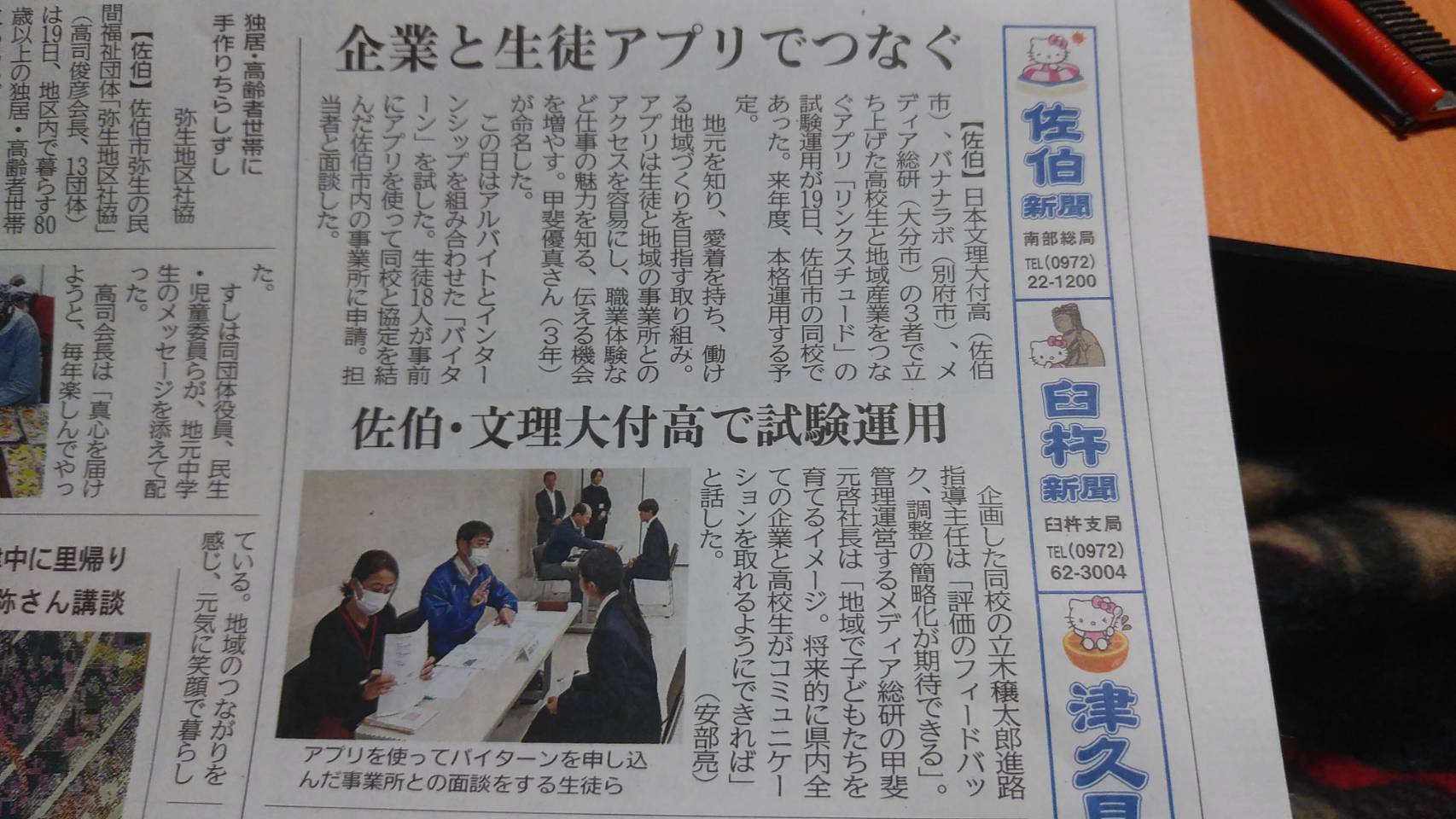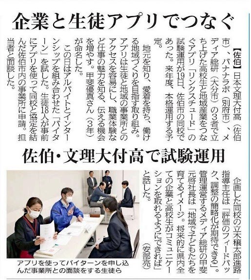 高校生と地域産業をつなぐアプリ「リンクスチュード」の試験運用が 大分合同新聞にて紹介されました