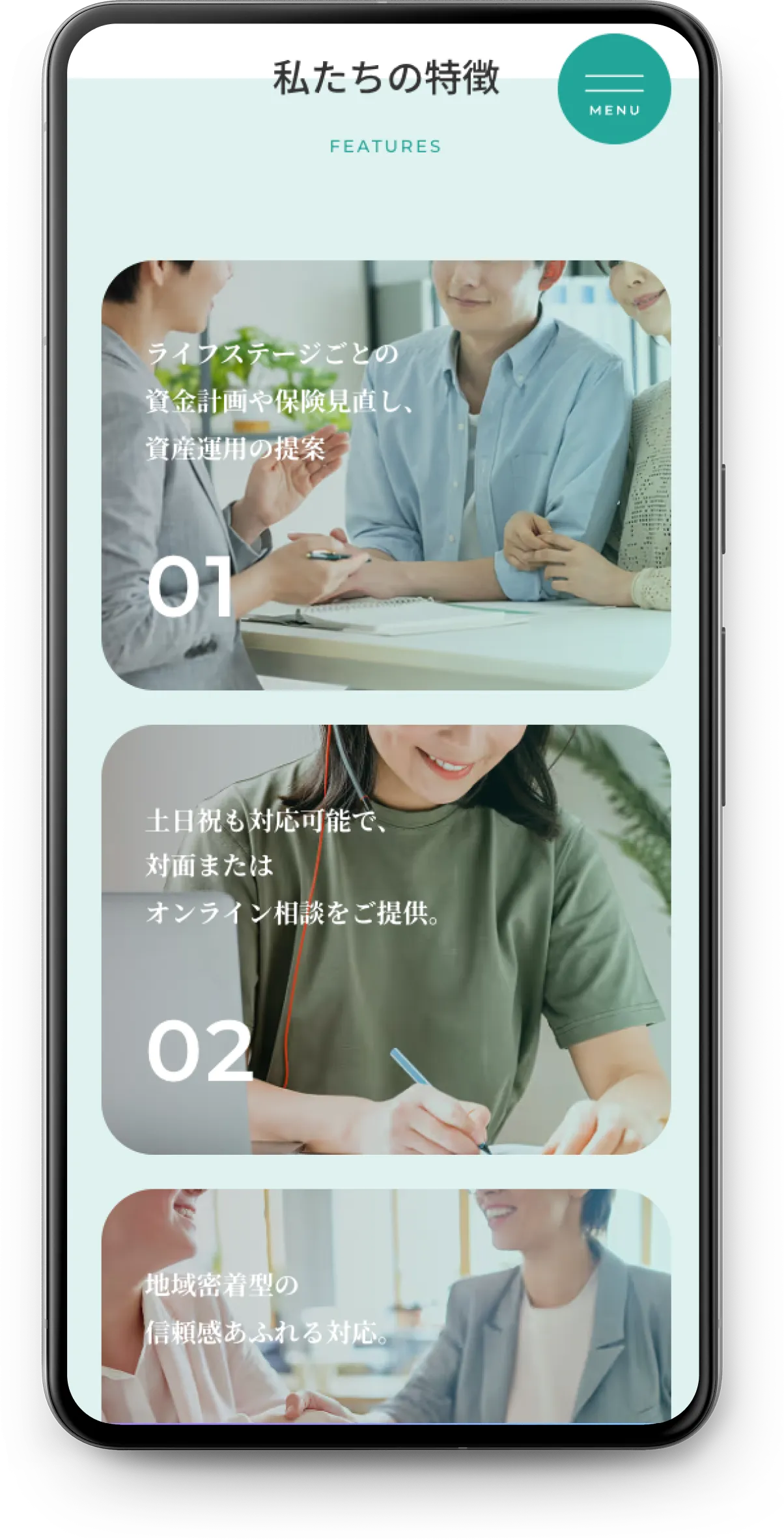 特に、ライフステージに応じた資金計画や、地域密着ならではの対面相談対応とオンライン相談の併用などの特徴を、視覚的にも伝わりやすい形で掲載。